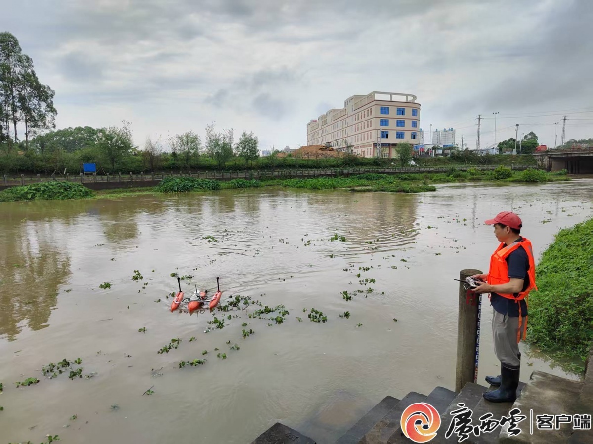 水文应急队员在北流河自良水文站上游监测流量。自治区水文中心 供图
