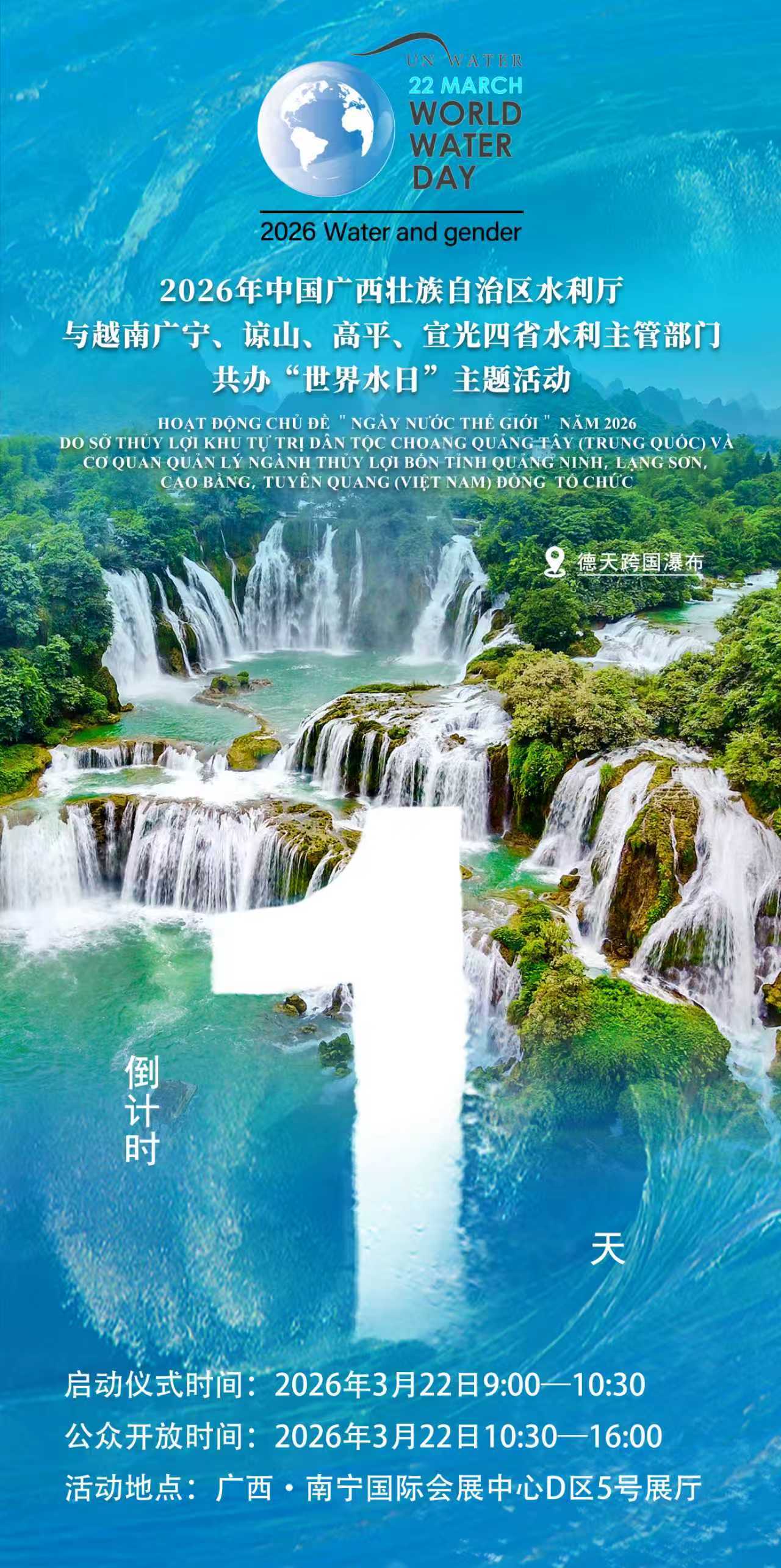 2026年中国广西壮族自治区水利厅与越南广宁、谅山、高平、宣光四省水利主管部门共办“世界水日”主题活动倒计时1天