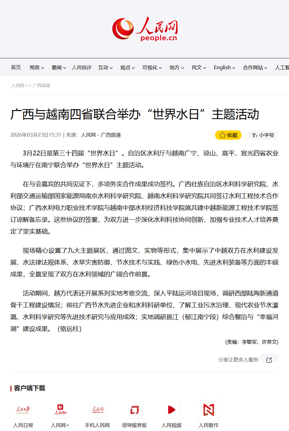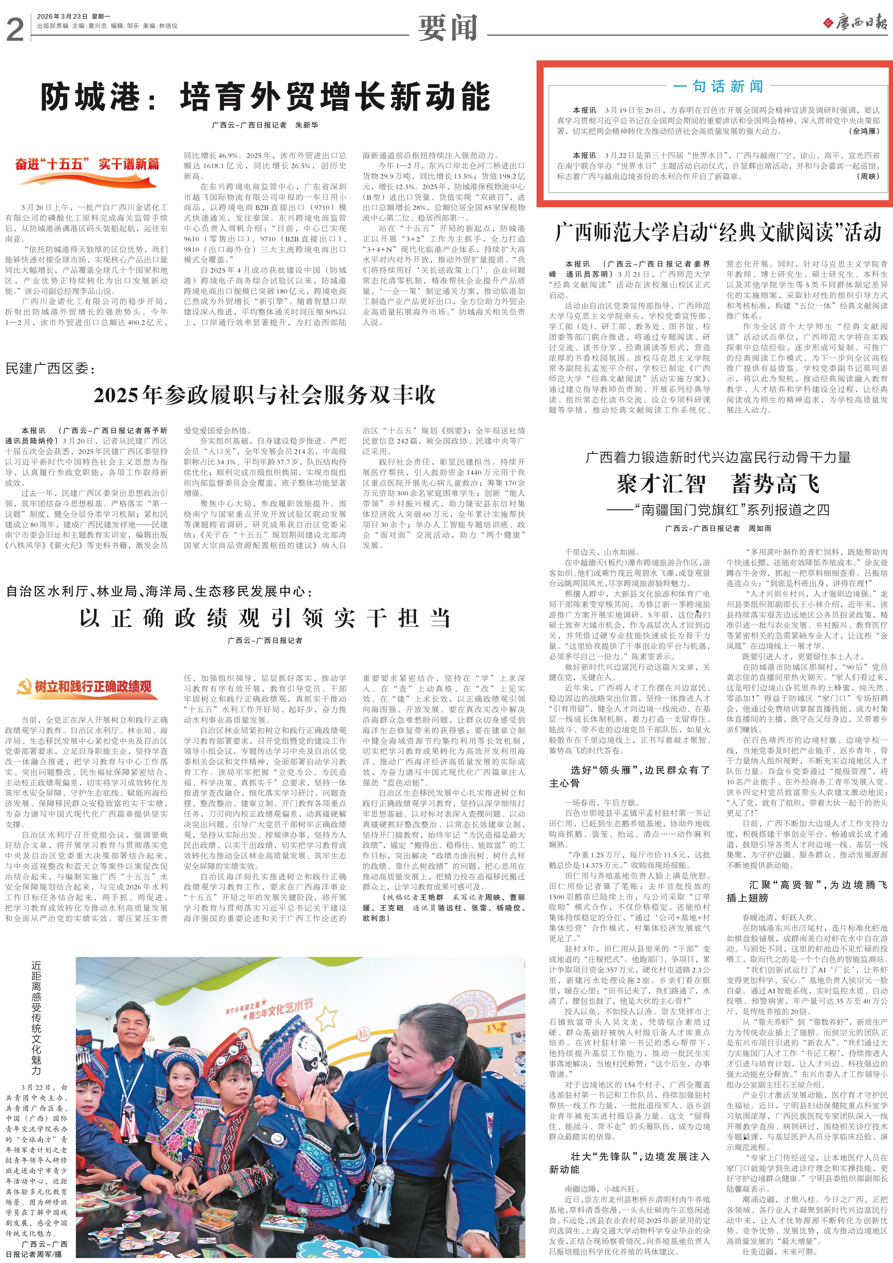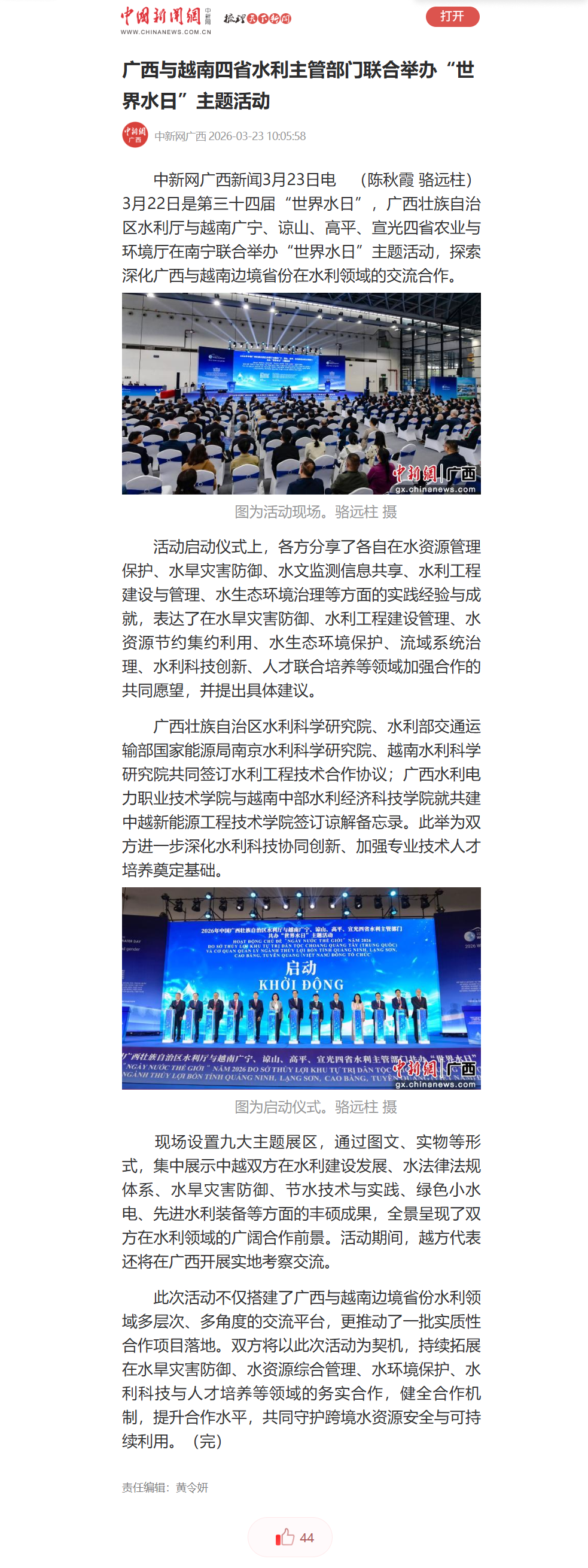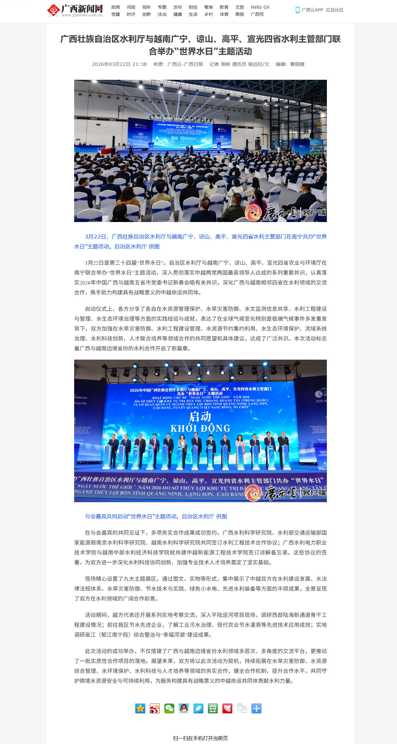 3月22日是第三十四届“世界水日”。自治区水利厅与越南广宁、谅山、高平、宣光四省农业与环境厅在南宁联合举办“世界水日”主题活动,多家中央和自治区主流媒体对活动进行了报道。