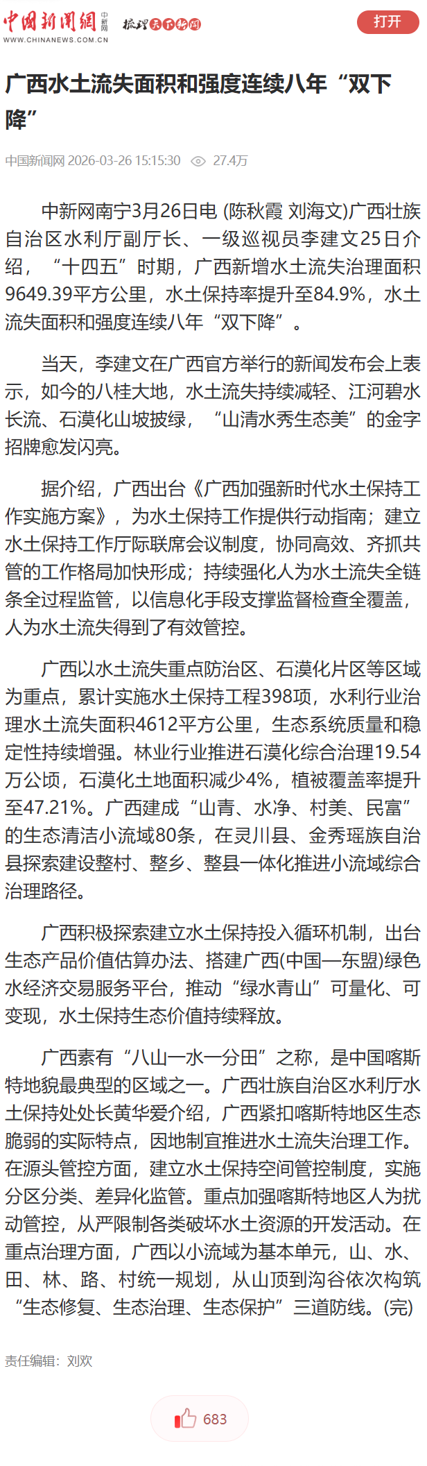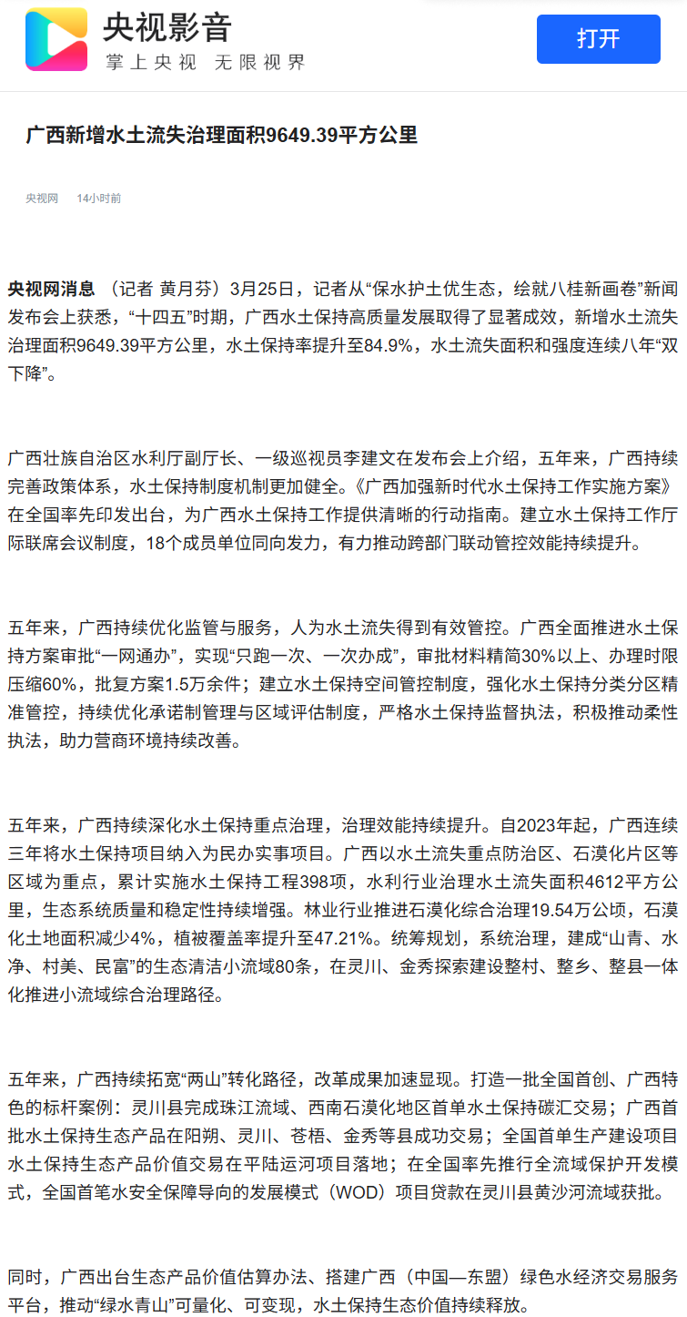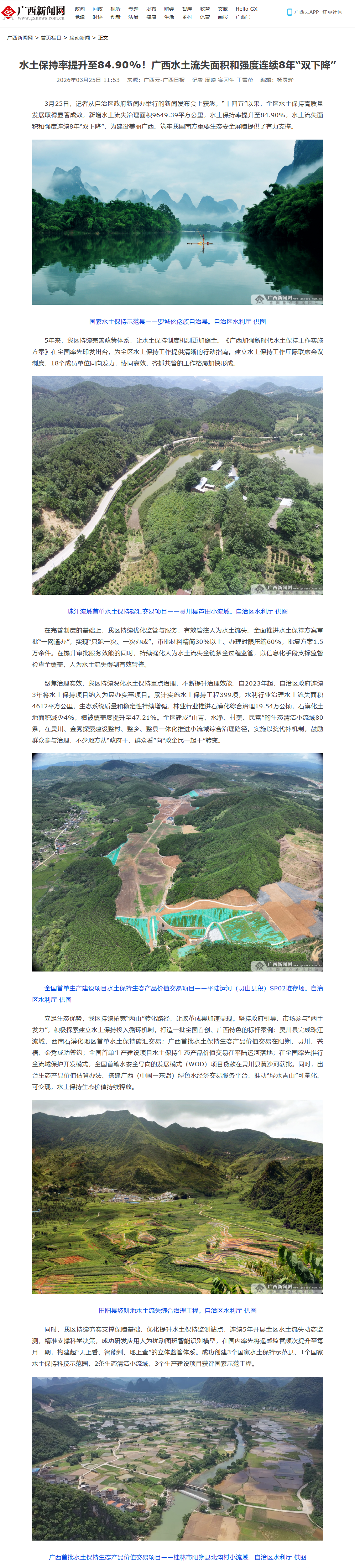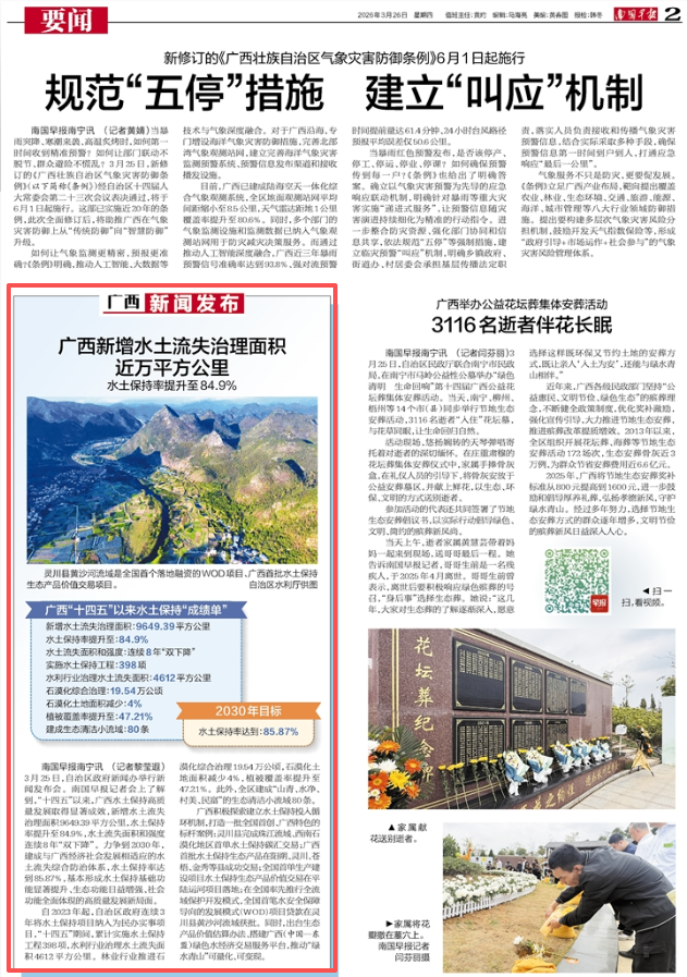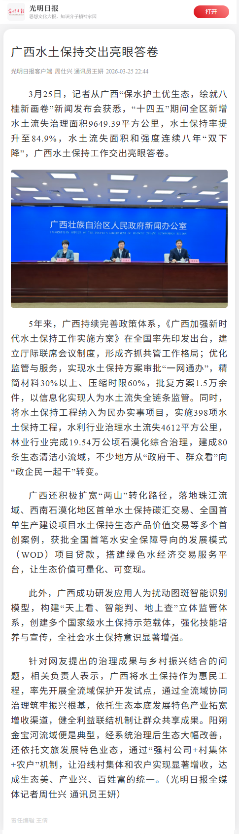 3月25日,广西壮族自治区人民政府新闻办公室举行保水护土优生态,绘就八桂新画卷新闻发布会,邀请自治区水利厅有关负责同志介绍相关情况并回答记者提问,多家中央和自治区主流媒体对广西水土保持工作成效进行了报道。