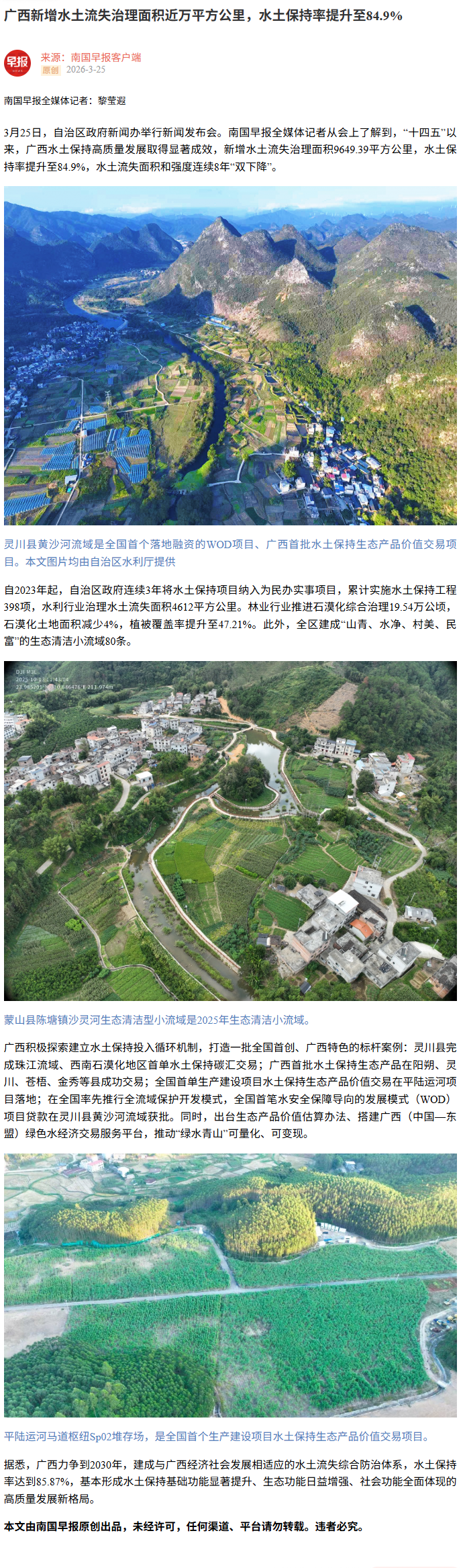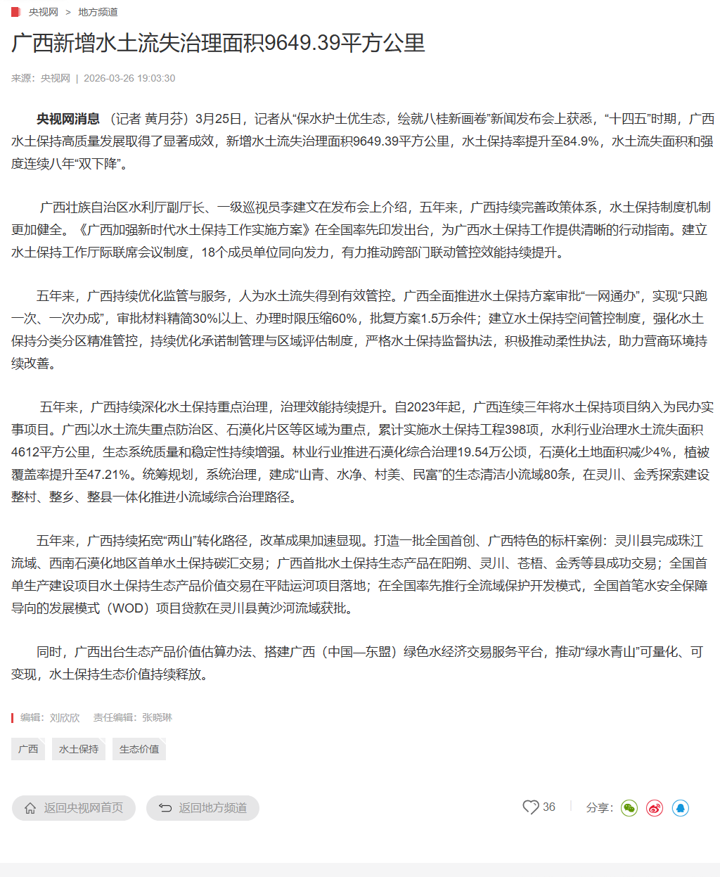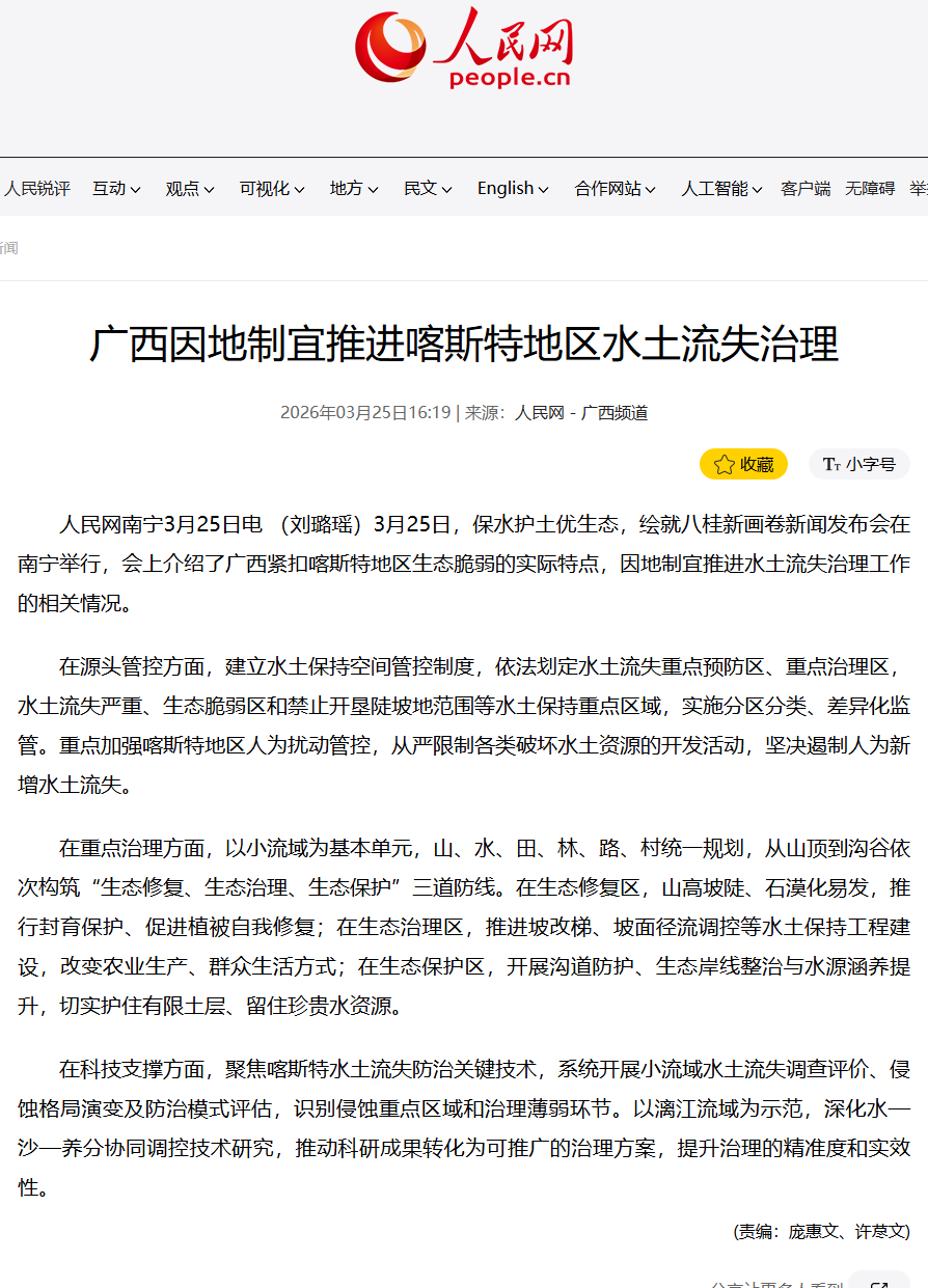 3月25日,广西壮族自治区人民政府新闻办公室举行保水护土优生态,绘就八桂新画卷新闻发布会,邀请自治区水利厅有关负责同志介绍相关情况并回答记者提问,多家中央和自治区主流媒体对广西水土保持工作成效进行了报道。