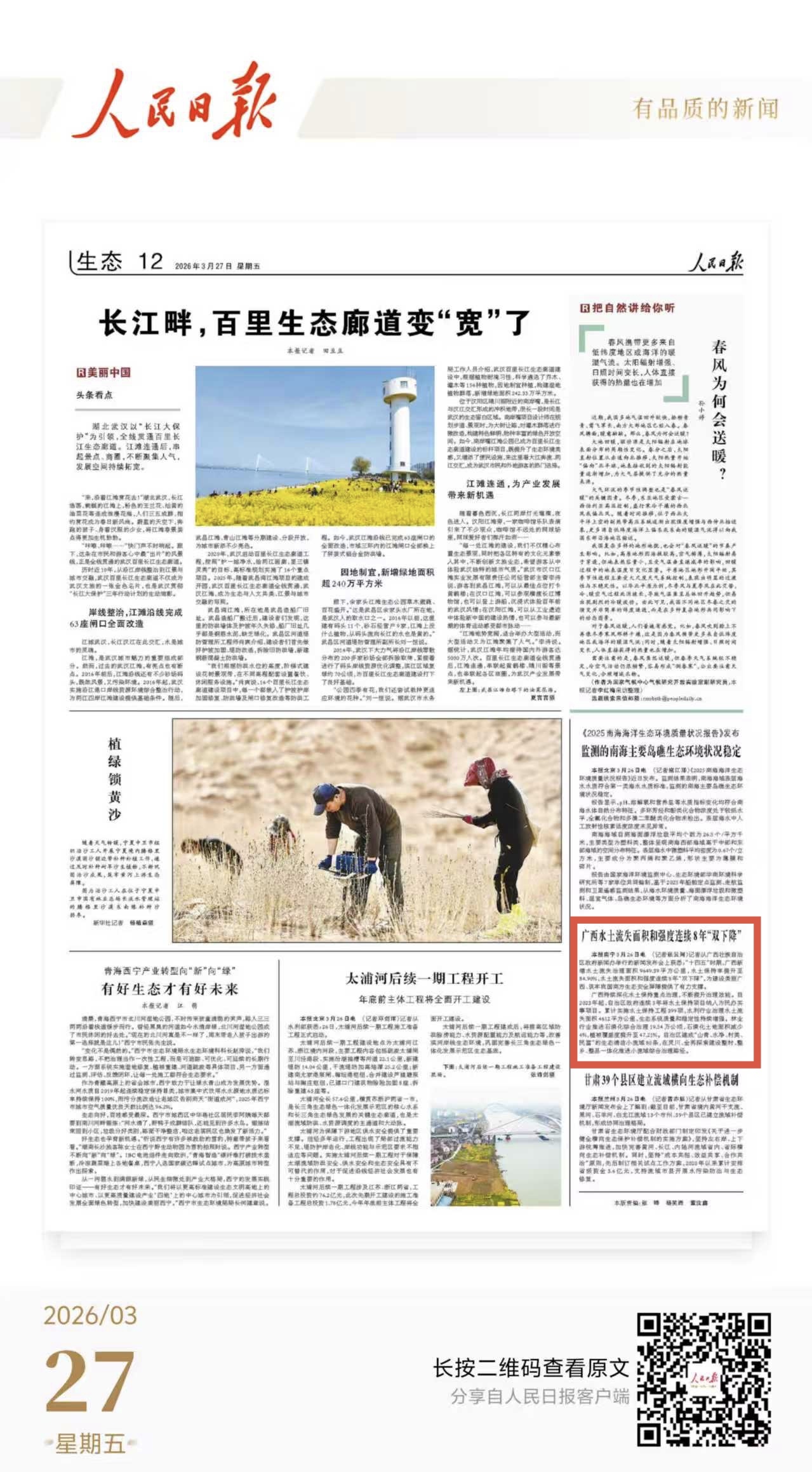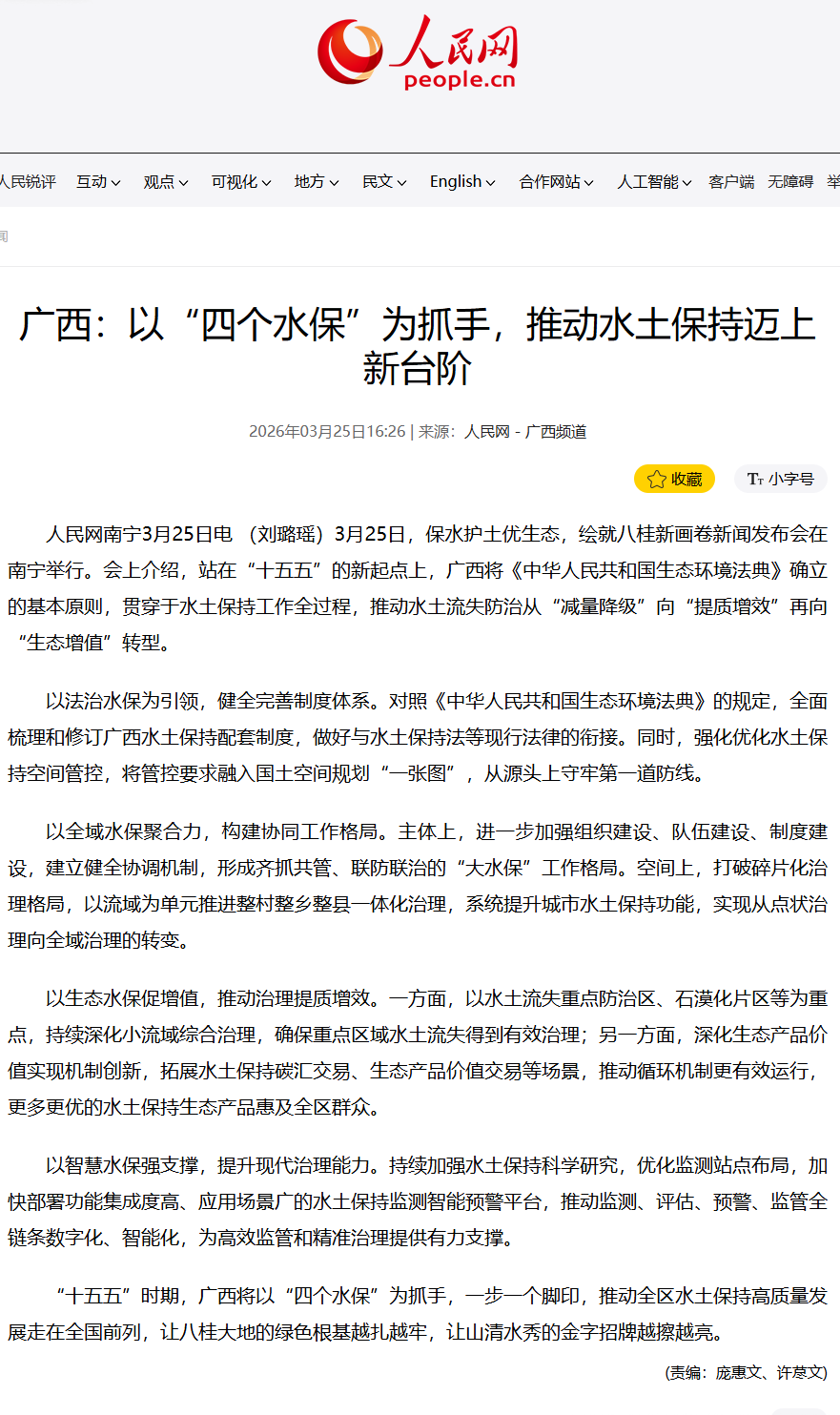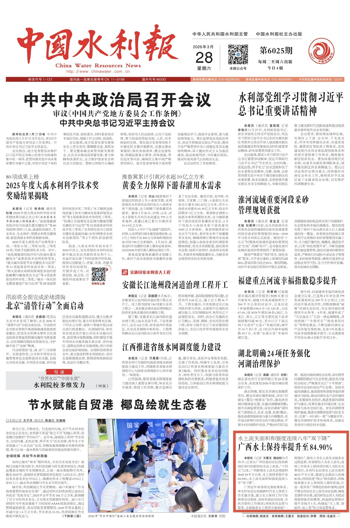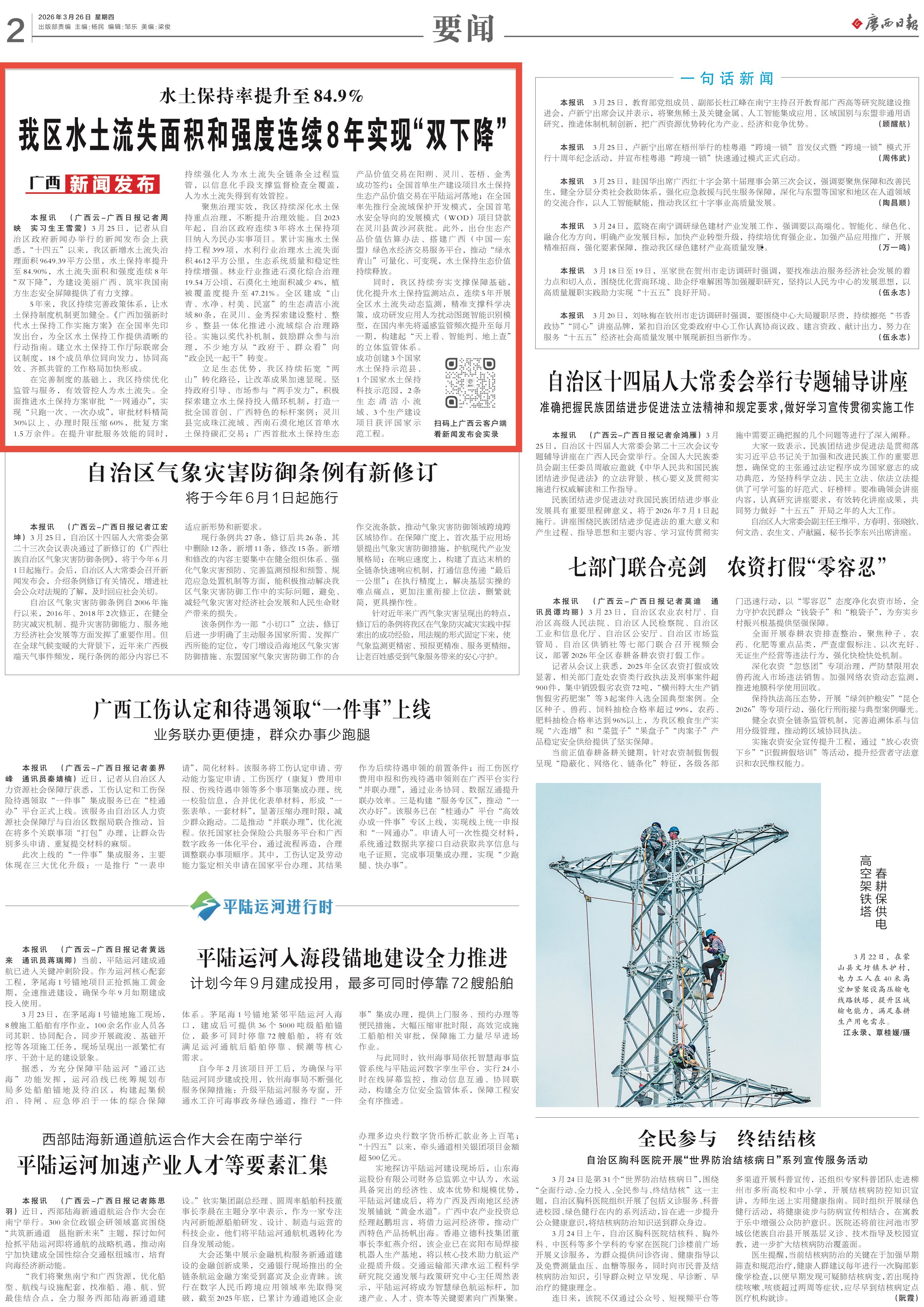 3月25日,广西壮族自治区人民政府新闻办公室举行保水护土优生态,绘就八桂新画卷新闻发布会,邀请自治区水利厅有关负责同志介绍相关情况并回答记者提问,多家中央和自治区主流媒体对广西水土保持工作成效进行了报道。