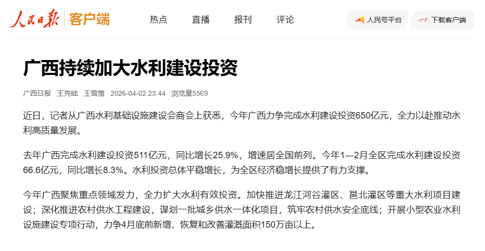 近日,记者从广西水利基础设施建设会商会上获悉,今年广西力争完成水利建设投资650亿元,全力以赴推动水利高质量发展。