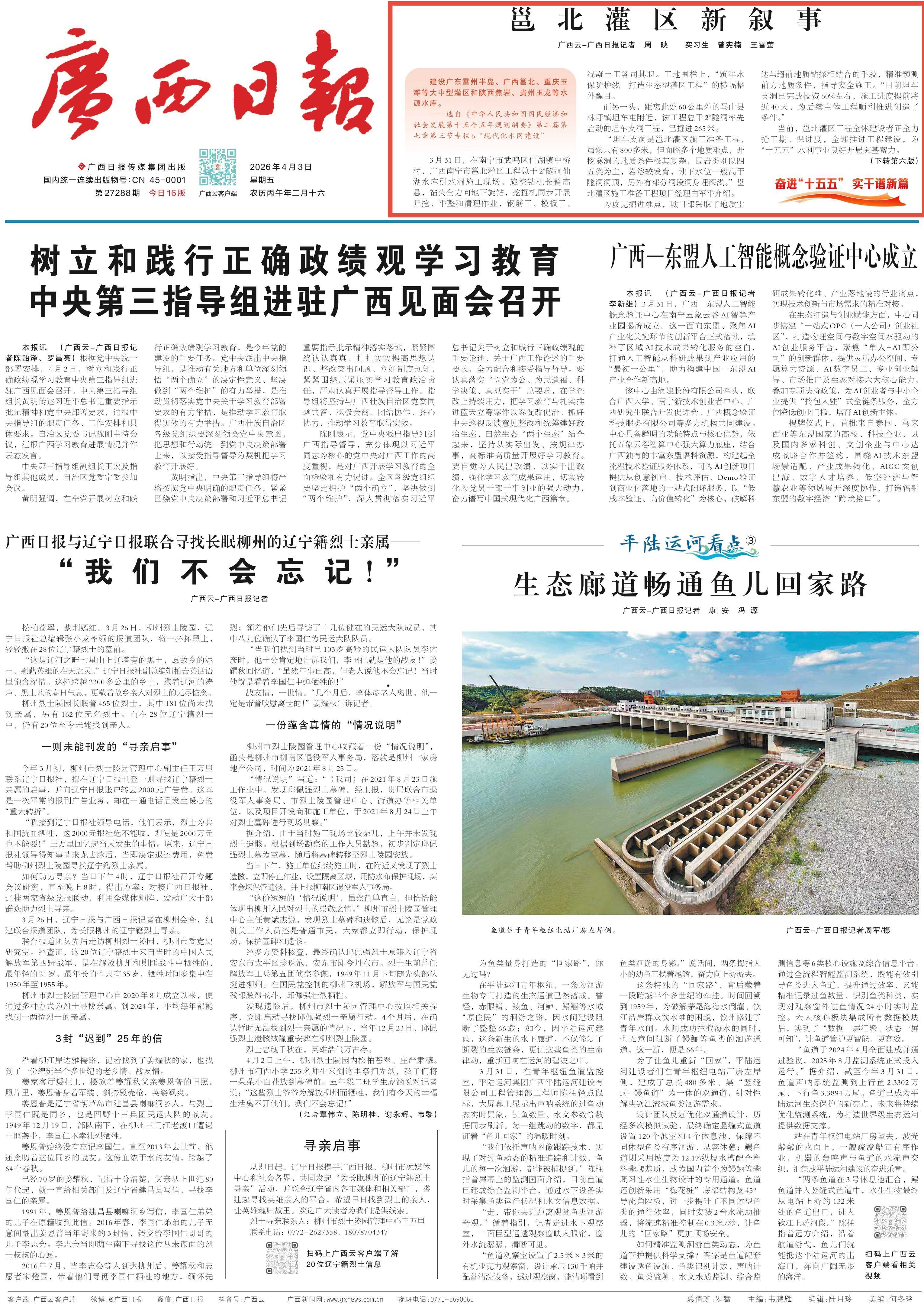 3月31日,在南宁市武鸣区仙湖镇中桥村,广西南宁市邕北灌区工程总干2#隧洞仙湖水库引水洞施工现场,旋挖钻机长臂高悬,钻头全力向地下旋钻,挖掘机同步开展开挖、平整和清理作业,钢筋工、模板工、混凝土工各司其职。工地围栏上,“筑牢水保防护线 打造生态型灌区工程”的横幅格外醒目。