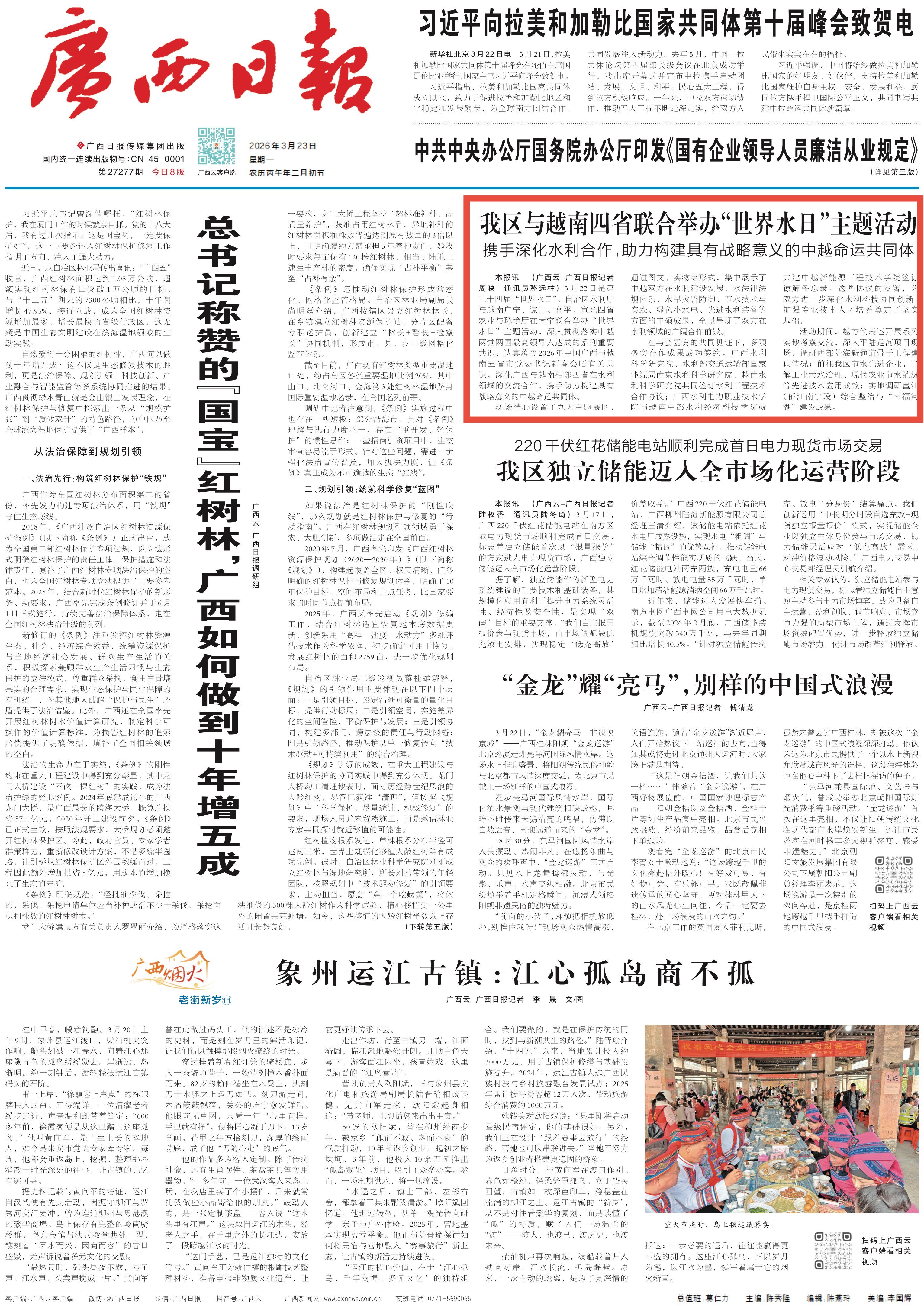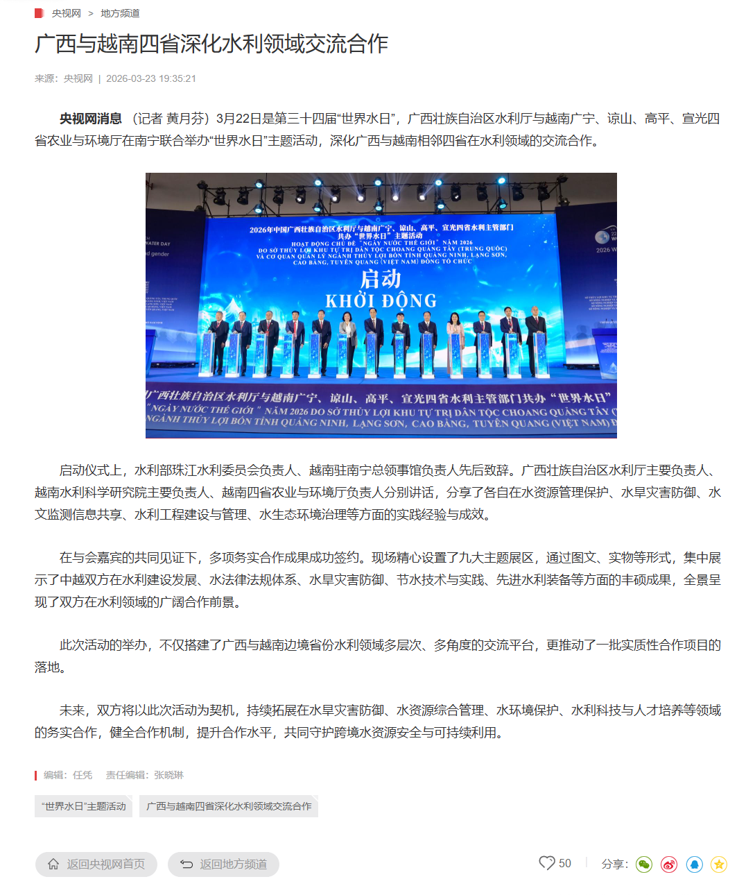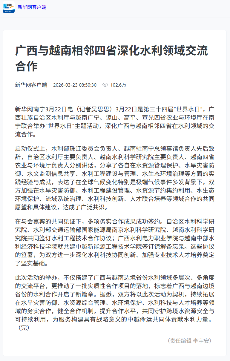 3月22日是第三十四届“世界水日”。自治区水利厅与越南广宁、谅山、高平、宣光四省农业与环境厅在南宁联合举办“世界水日”主题活动,多家中央和自治区主流媒体对活动进行了报道。