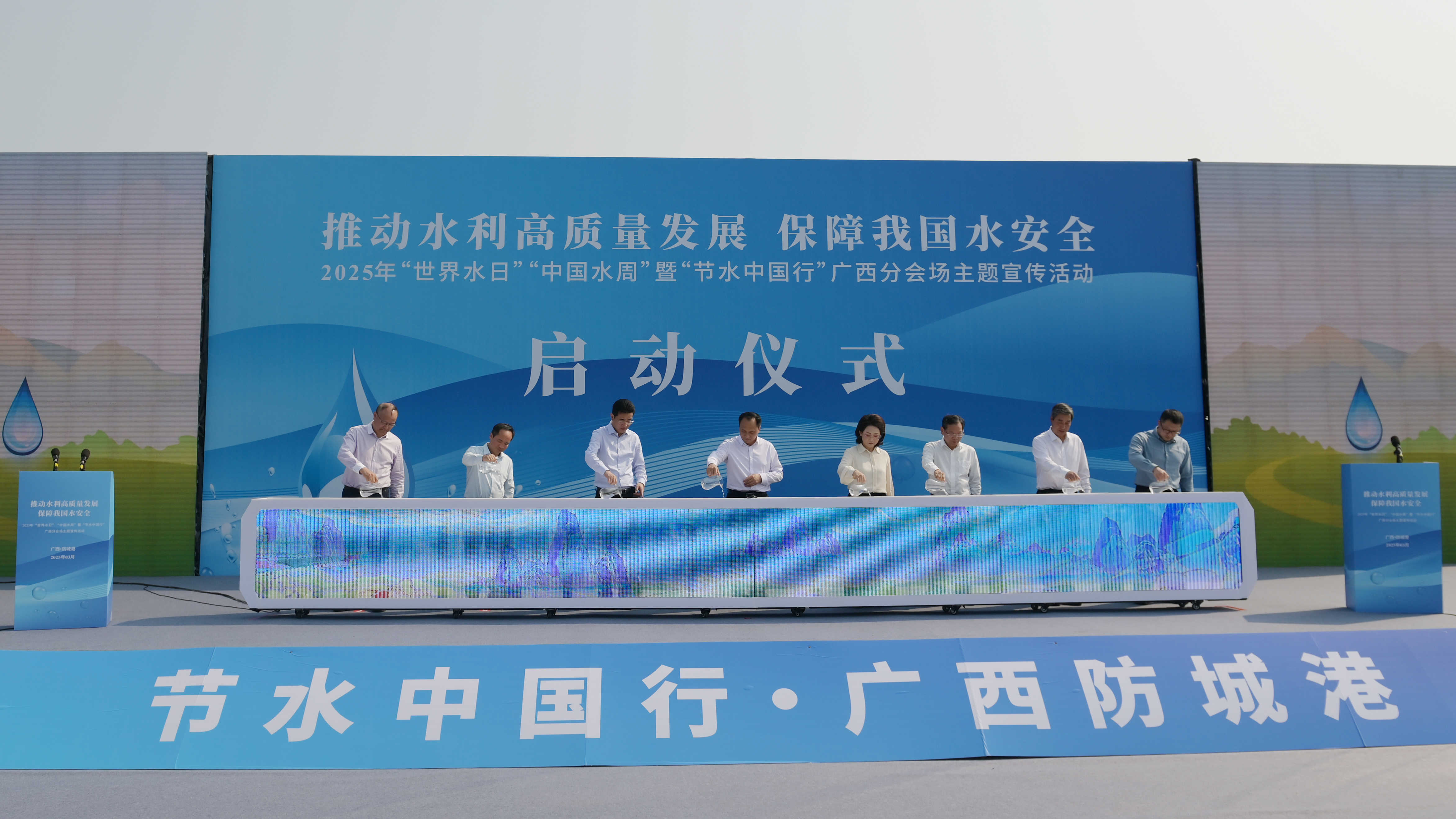 3月22日,自治区水利厅、防城港市人民政府、水利部珠江水利委员会及广西水利发展集团有限公司在防城港市北部湾海洋文化公园举行“世界水日”“中国水周”暨“节水中国行”广西分会场主题宣传活动启动仪式。作为“节水中国行”主题宣传活动全国9个分会场城市之一,防城港市以“非常之水,非凡之治”和“节水珠江,你我同行”为宣传主题。自治区分管领导,水利部节约用水促进中心、珠江水利委员会,防城港市委、市政府,自治区各有关部门,南京水利科学研究院,广西大学,以及有关企业代表、防城港市节水护水志愿服务队、“河小青”、民间巡河护河员志愿者及媒体记者等500余人出席启动仪式。