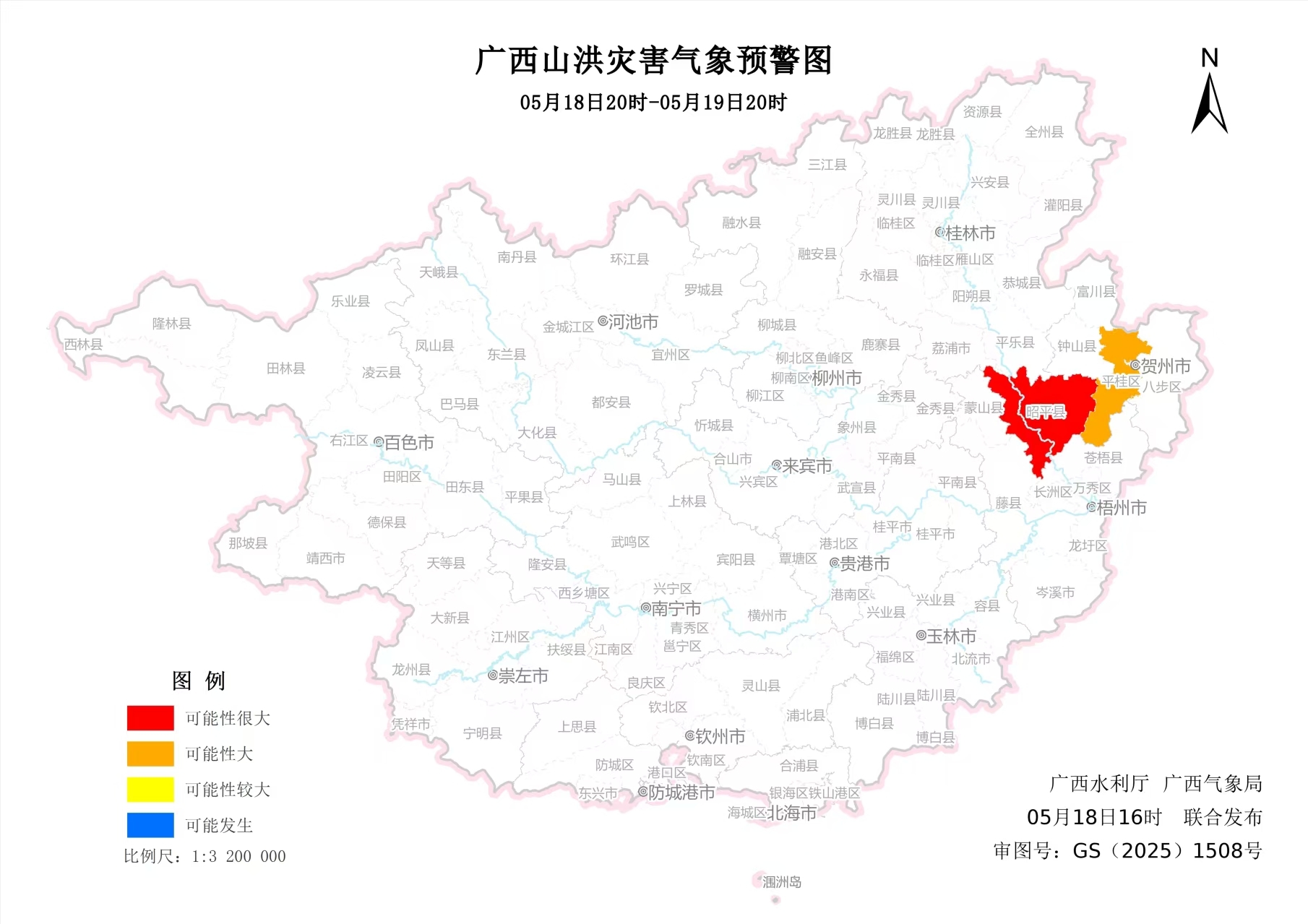 预计,5月18日20时至5月19日20时,贺州市西部发生山洪灾害可能性很大(红色预警)。请各影响区注意做好监测、巡查、预警和转移避险等山洪灾害防范工作。