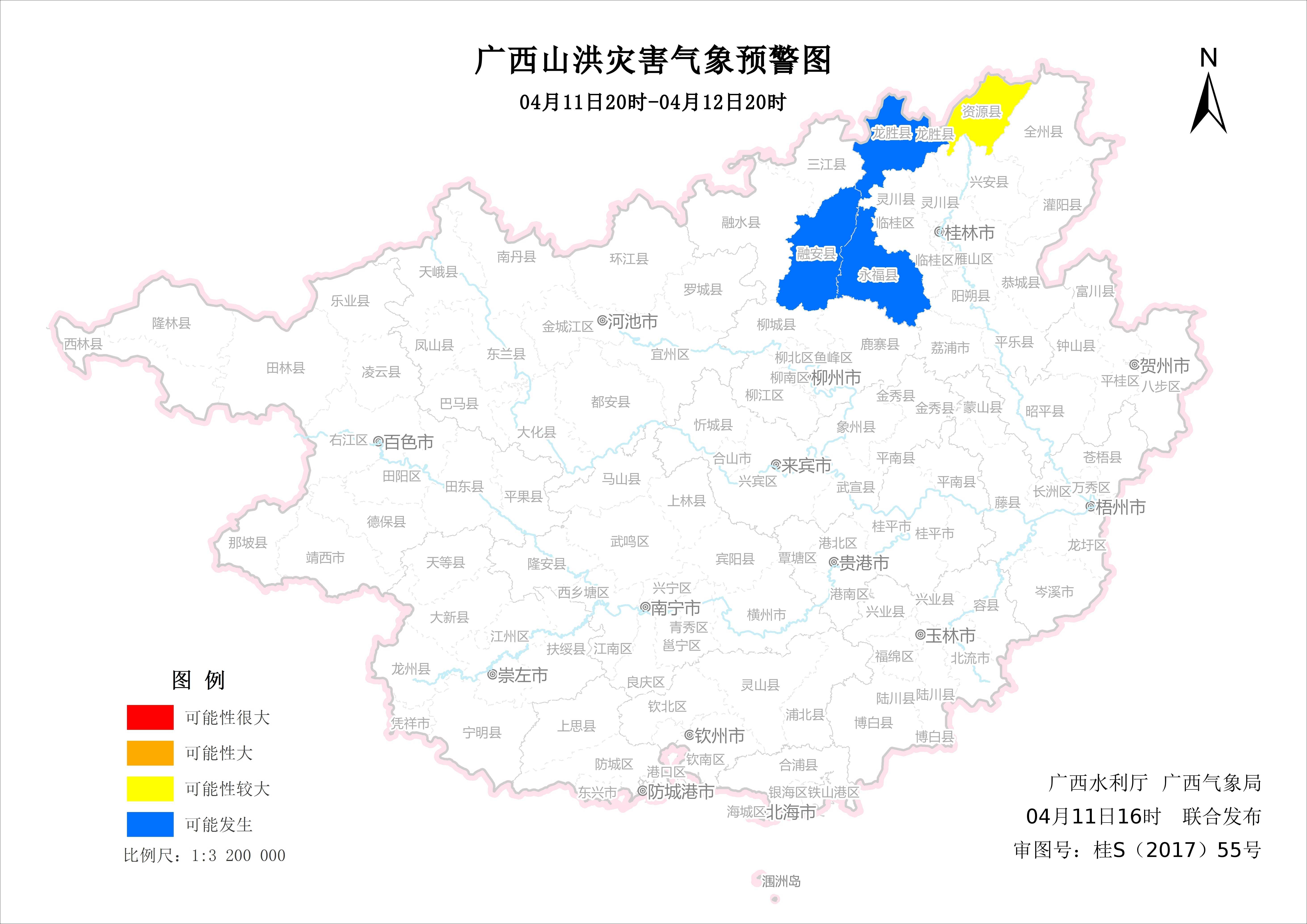 预计,4月11日20时至4月12日20时,桂林市北部发生山洪灾害可能性较大(黄色预警),柳州市中部可能发生山洪灾害(蓝色预警)。请各影响区注意做好监测、巡查、预警和转移避险等山洪灾害防范工作。