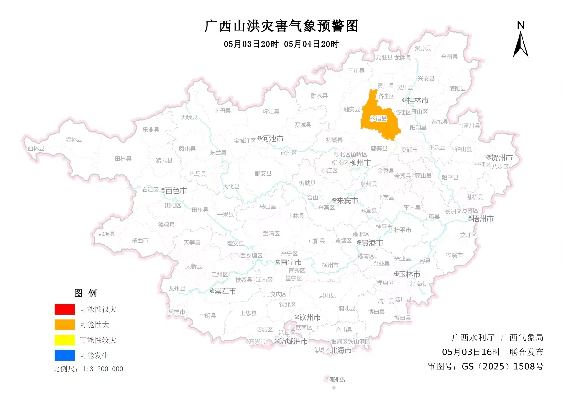 预计,5月3日20时至5月4日20时,桂林市西部发生山洪灾害可能性大(橙色预警)。请各影响区注意做好监测、巡查、预警和转移避险等山洪灾害防范工作。