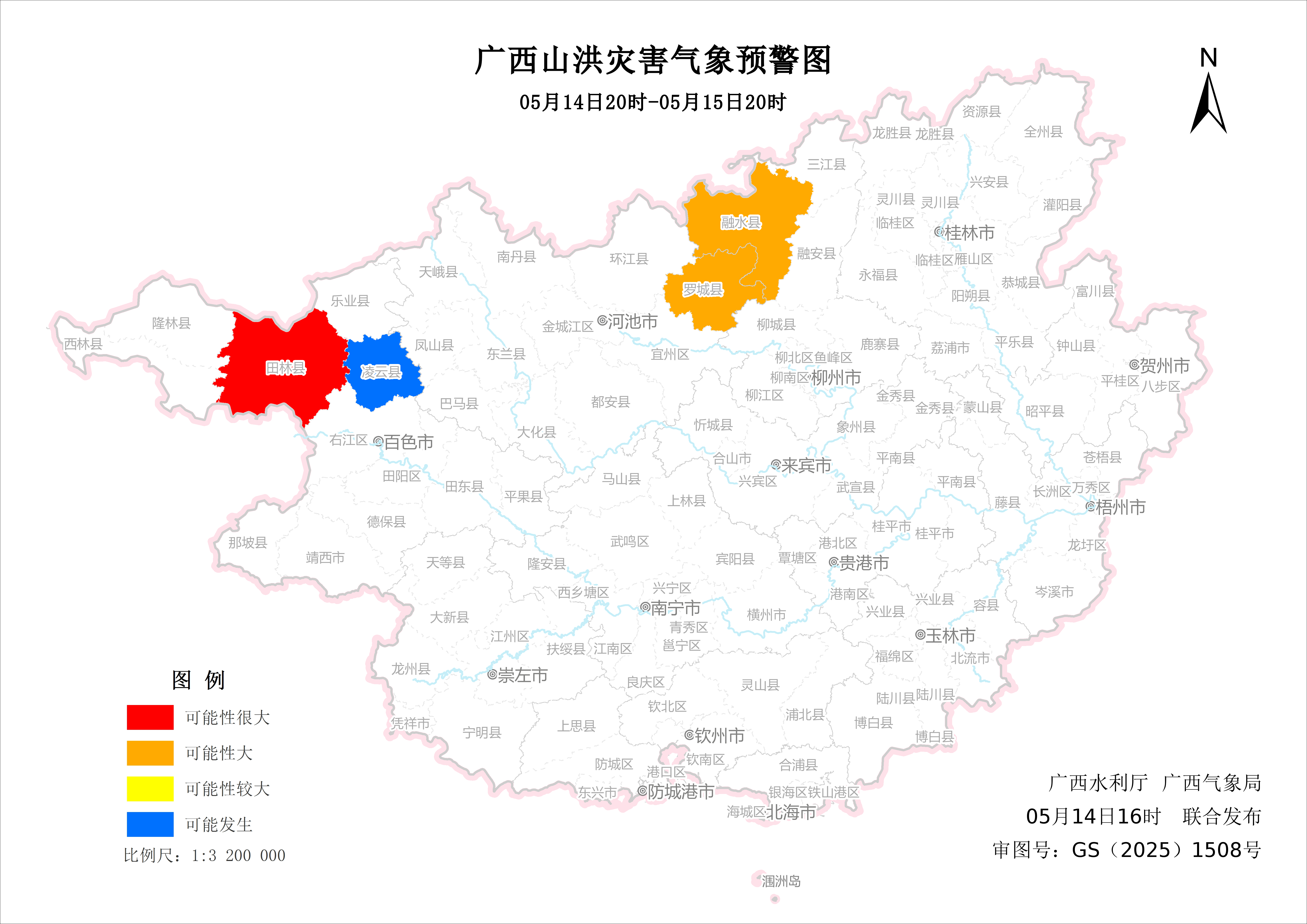 预计,5月14日20时至5月15日20时,百色市西北部发生山洪灾害可能性很大(红色预警),柳州市北部、河池市东部发生山洪灾害可能性大(橙色预警)。请各影响区注意做好监测、巡查、预警和转移避险等山洪灾害防范工作。