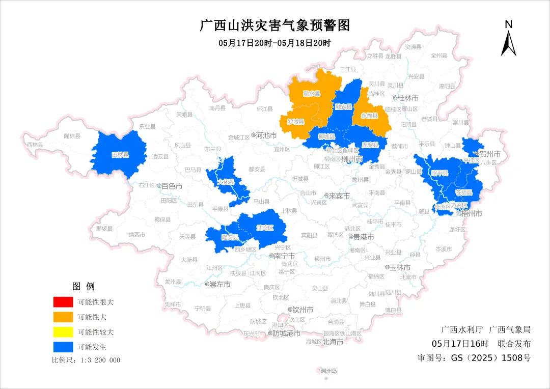 预计,5月17日20时至5月18日20时,柳州市北部、桂林市西部、河池市东部发生山洪灾害可能性大(橙色预警),南宁市中部、西部,梧州市中部、北部,百色市西北部,贺州市中部、西部可能发生山洪灾害(蓝色预警)。请各影响区注意做好监测、巡查、预警和转移避险等山洪灾害防范工作。