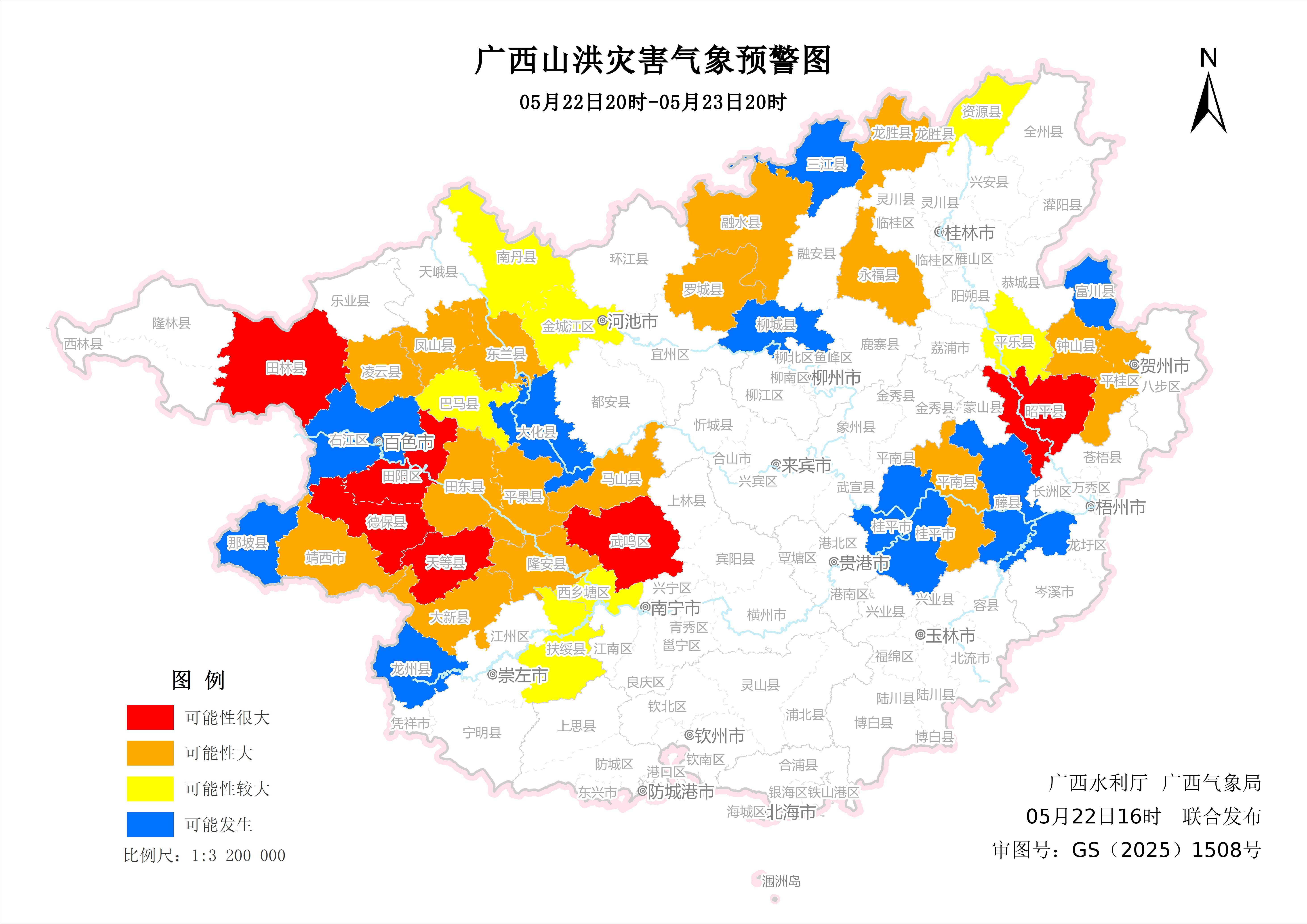 广西水利厅和广西气象局于5月22日16时联合发布山洪灾害气象预警: