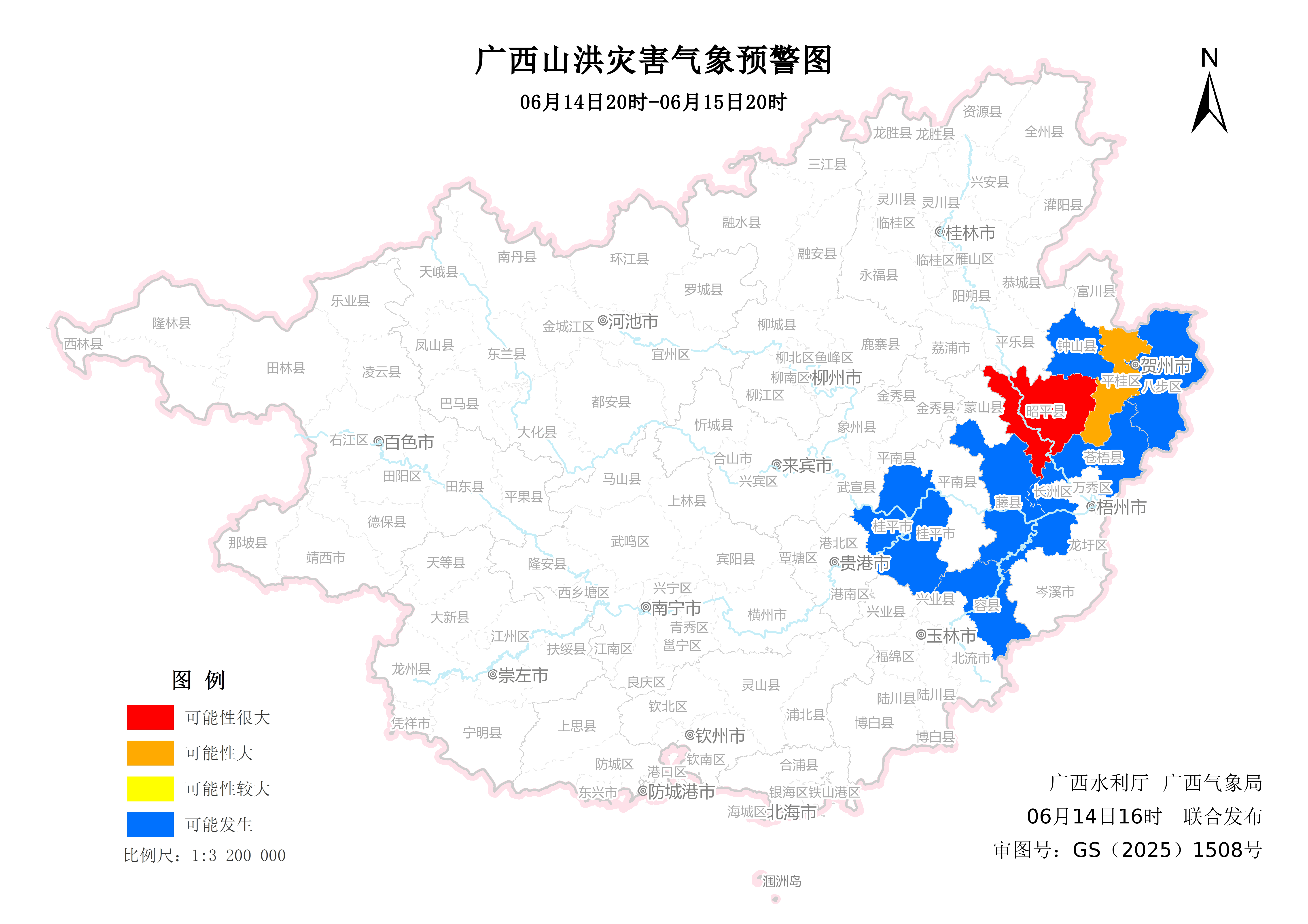 预计,6月14日20时至6月15日20时,贺州市西部发生山洪灾害可能性很大(红色预警),梧州市西北部、贵港市中部、玉林市东部可能发生山洪灾害(蓝色预警)。请各影响区注意做好监测、巡查、预警和转移避险等山洪灾害防范工作。