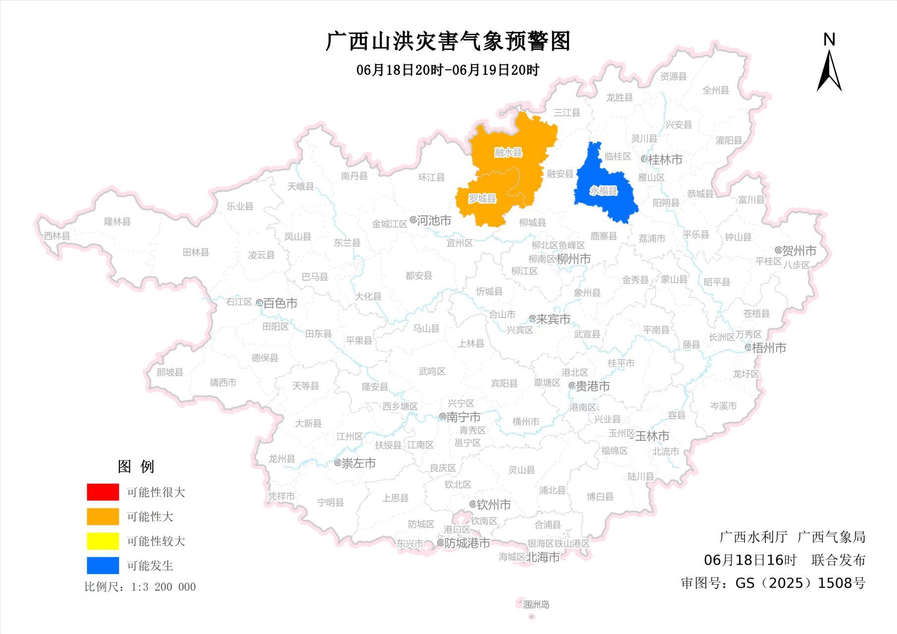 预计,6月18日20时至6月19日20时,柳州市北部、河池市东部发生山洪灾害可能性大(橙色预警),桂林市西部可能发生山洪灾害(蓝色预警)。请各影响区注意做好监测、巡查、预警和转移避险等山洪灾害防范工作。
