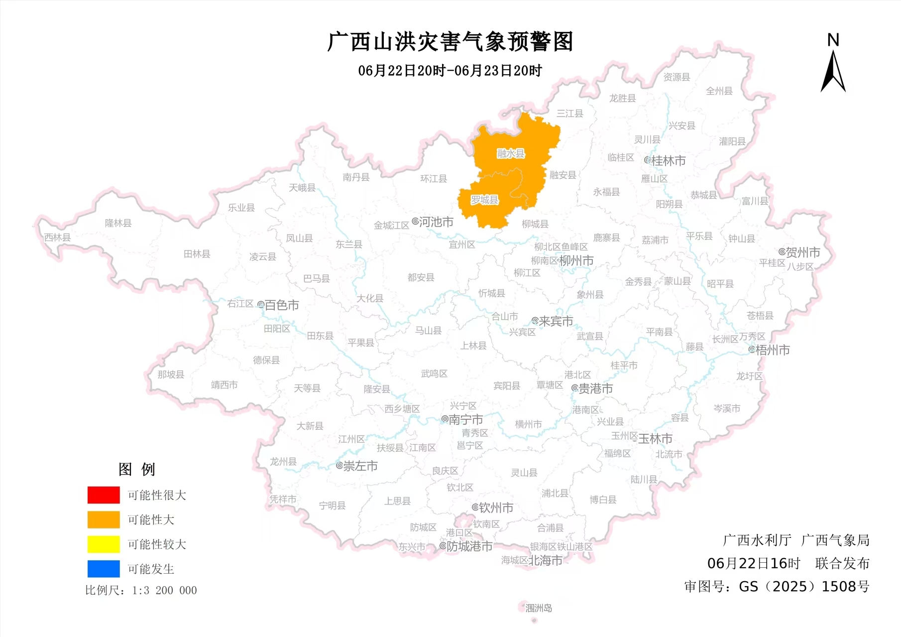 预计,6月22日20时至6月23日20时,柳州市北部、河池市东部发生山洪灾害可能性大(橙色预警)。请各影响区注意做好监测、巡查、预警和转移避险等山洪灾害防范工作。