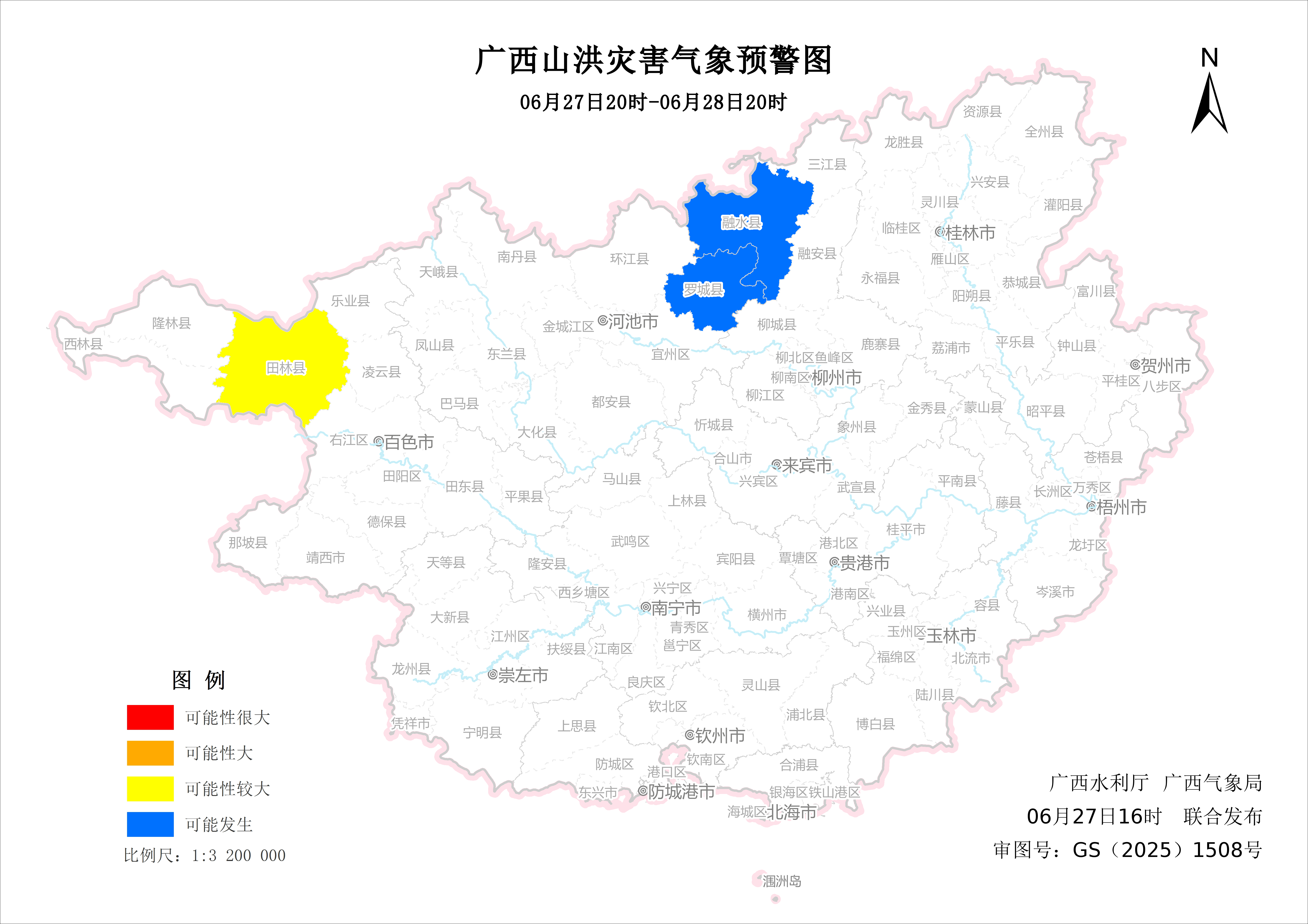 预计,6月27日20时至6月28日20时,百色市西北部发生山洪灾害可能性较大(黄色预警),柳州市北部、河池市东部可能发生山洪灾害(蓝色预警)。请各影响区注意做好监测、巡查、预警和转移避险等山洪灾害防范工作。