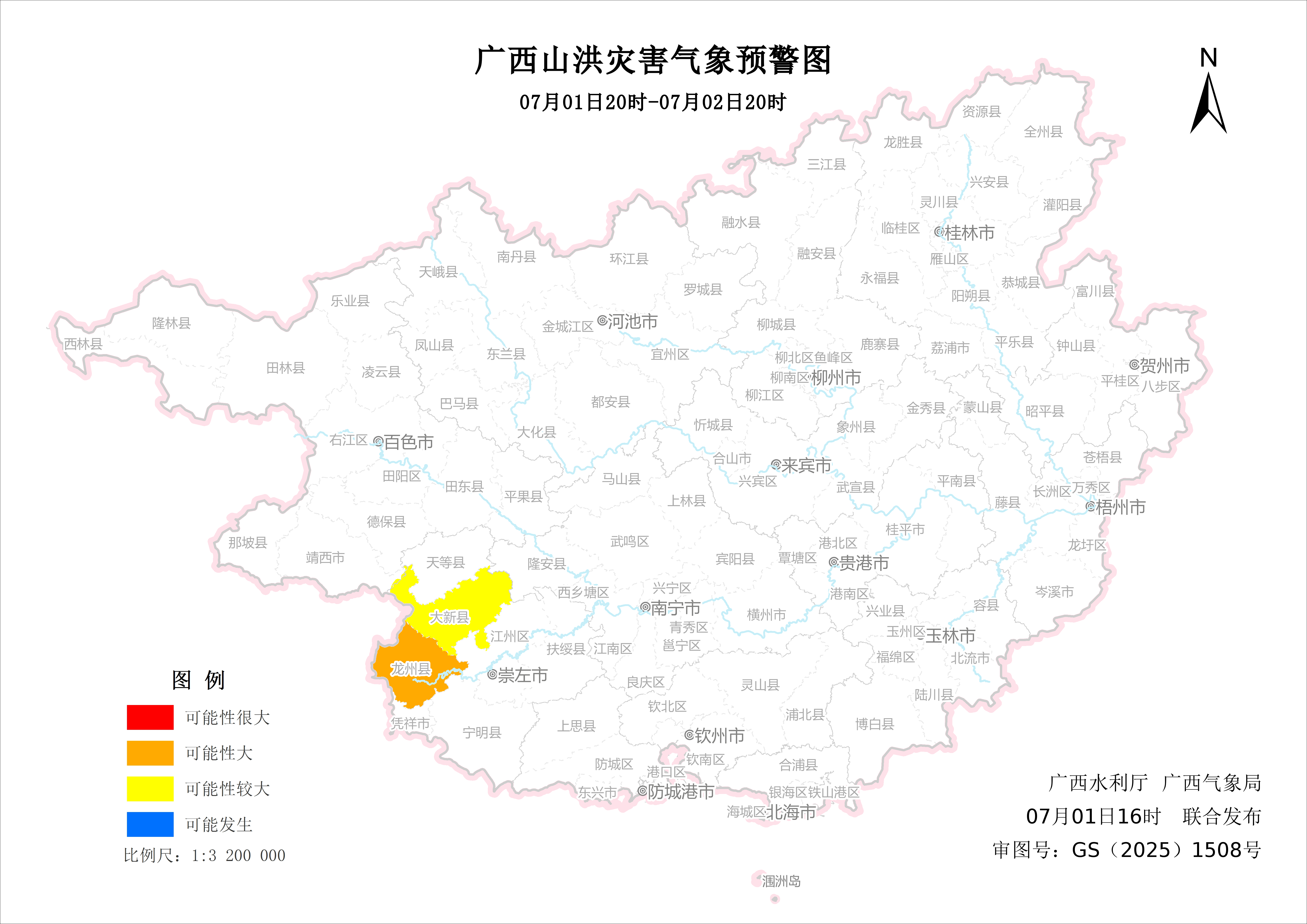 广西水利厅和广西气象局于7月1日16时联合发布山洪灾害气象预警: