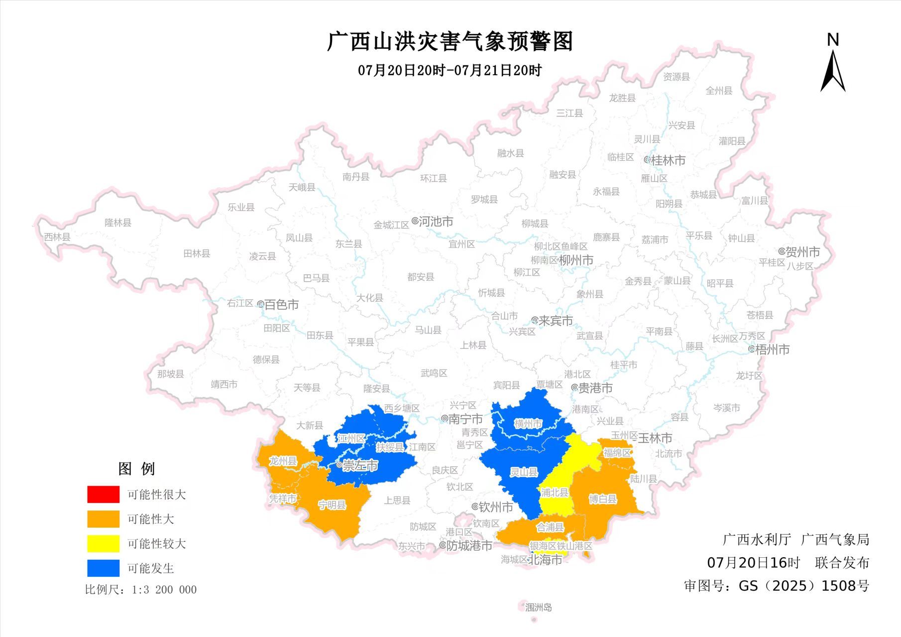 广西水利厅和广西气象局于7月20日16时联合发布山洪灾害气象预警: