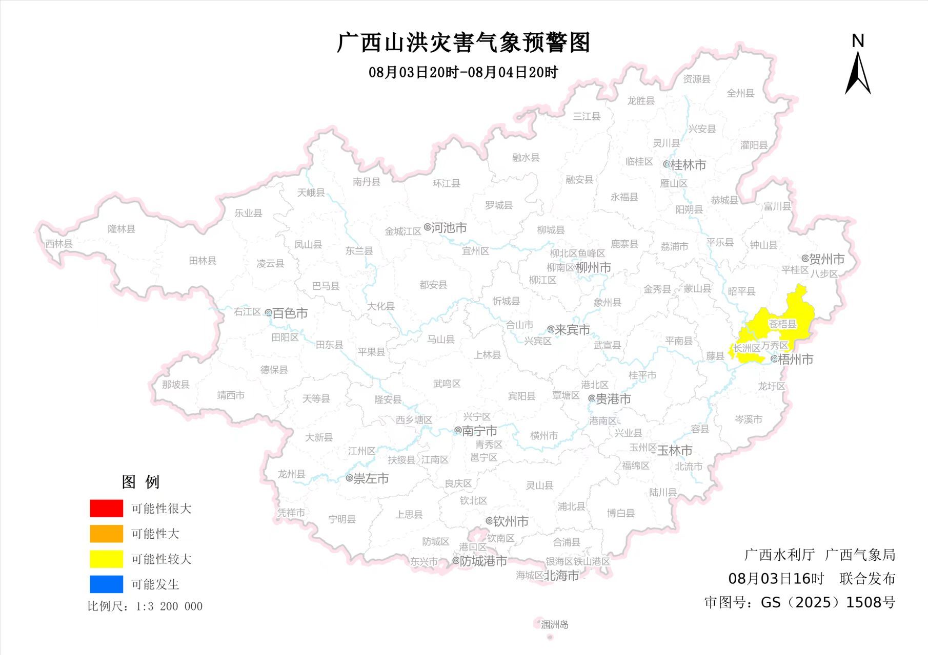 预计,08月03日20时至08月04日20时,梧州市北部发生山洪灾害可能性较大(黄色预警)。请各影响区注意做好监测、巡查、预警和转移避险等山洪灾害防范工作。