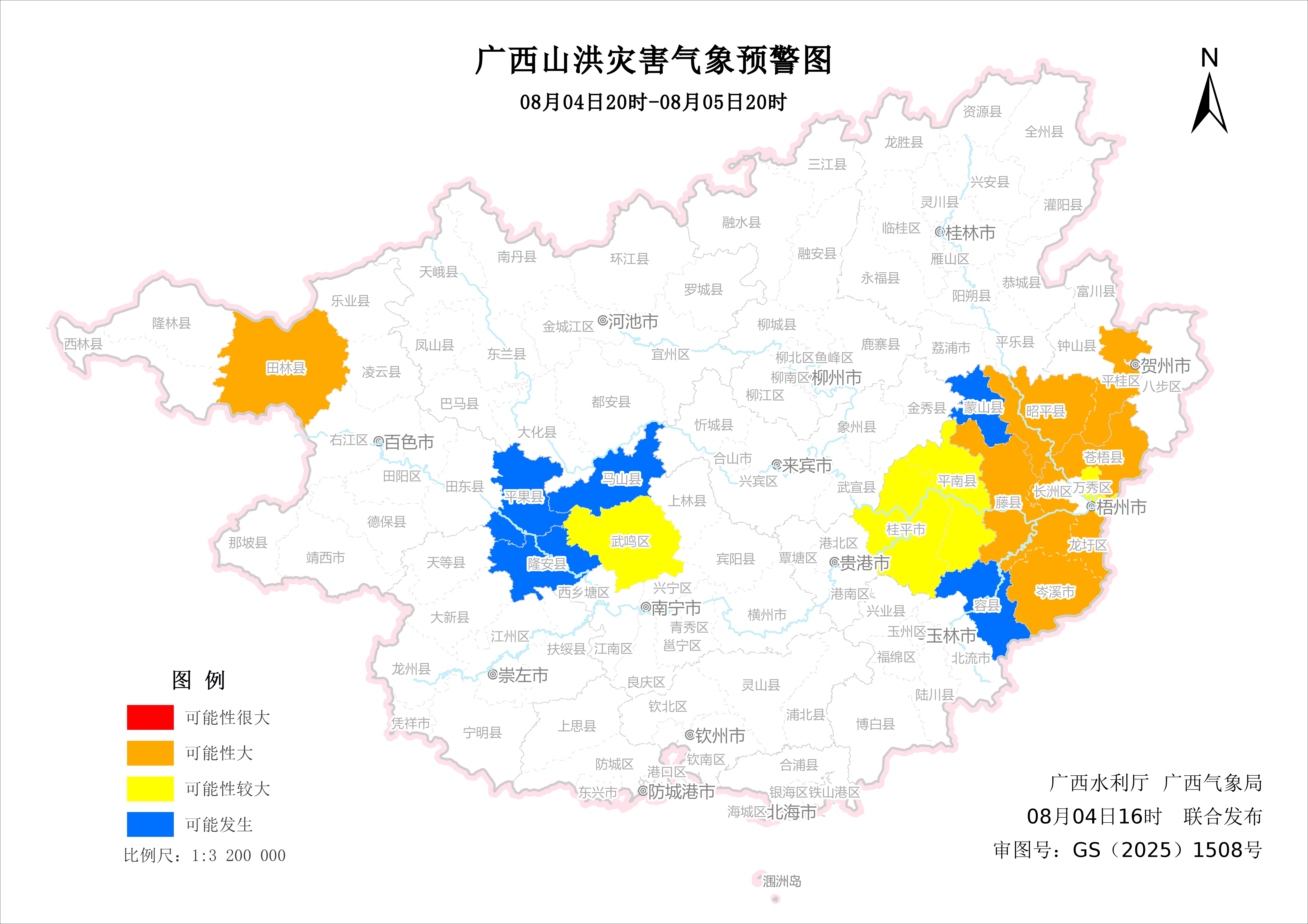 预计,08月04日20时至08月05日20时,梧州市大部分地区,百色市西北部,贺州市中部、西部发生山洪灾害可能性大(橙色预警),南宁市中部,贵港市东部、中部发生山洪灾害可能性较大(黄色预警),玉林市东部可能发生山洪灾害(蓝色预警)。请各影响区注意做好监测、巡查、预警和转移避险等山洪灾害防范工作。