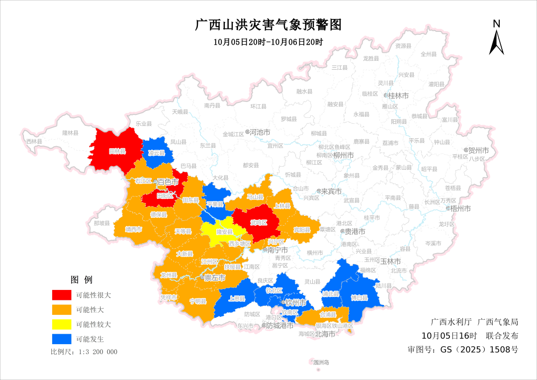 预计,10月05日20时至10月06日20时,南宁市中部、百色市中部、西北部发生山洪灾害可能性很大(红色预警),北海市中部、崇左市大部分地区发生山洪灾害可能性大(橙色预警),防城港市北部、钦州市大部分地区、玉林市西南部可能发生山洪灾害(蓝色预警)。请各影响区注意做好监测、巡查、预警和转移避险等山洪灾害防范工作。