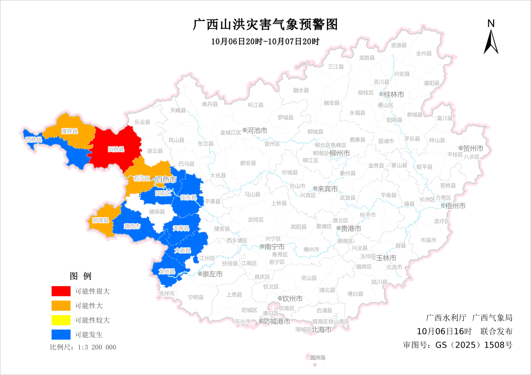 广西水利厅和广西气象局于10月06日16时联合发布山洪灾害气象预警: